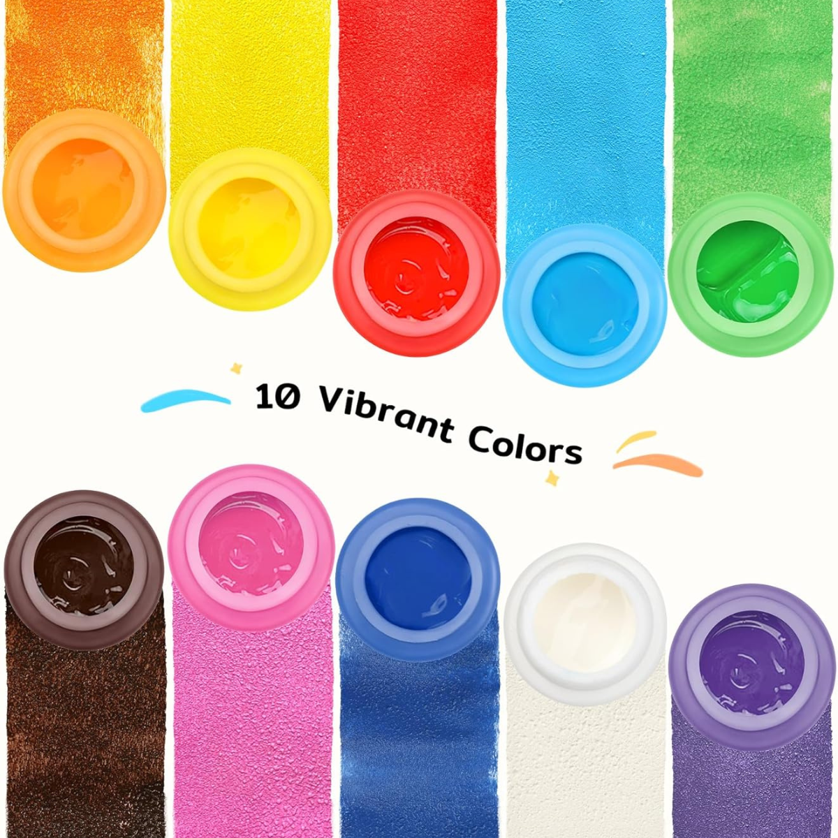 ✔️ 10 ζωηρά χρώματα σε ασφαλή μπουκαλάκια – Με καπάκια ασφαλείας και παχύρρευστη υφή, ιδανική για παιδιά.