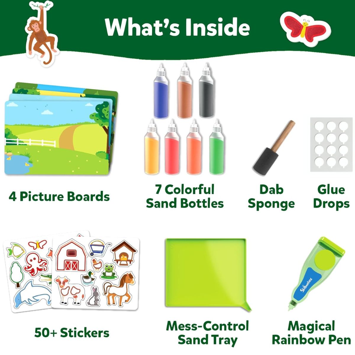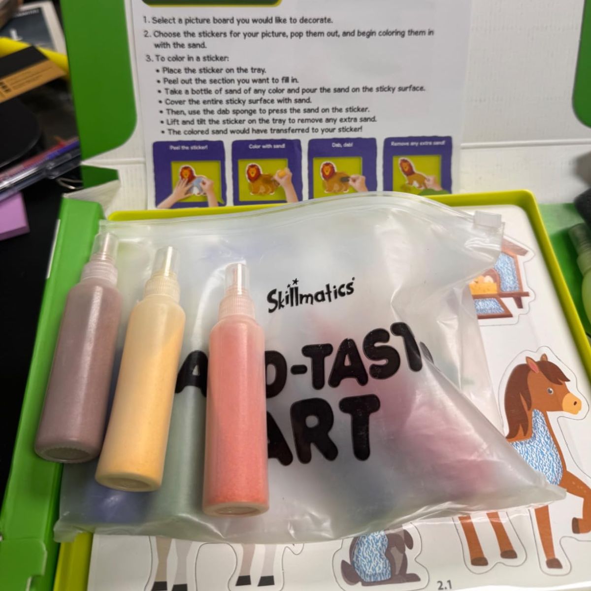 Ζωντανέψτε πάνω από 50 αυτοκόλλητα με υπέροχη πολύχρωμη άμμο! 🌈 Τα παιδιά μπορούν να δημιουργήσουν εκπληκτικές σκηνές με μαϊμούδες, ελέφαντες, ιππόκαμπους και άλλα – ιδανικό για ώρες φανταστικού παιχνιδιού. Απλά επιλέξτε το αγαπημένο σας αυτοκόλλητο, αφαιρέστε την προστατευτική μεμβράνη, ρίξτε την πολύχρωμη άμμο και δημιουργήστε υπέροχα αυτοκόλλητα! – χωρίς κόλλα ή ψαλίδι. ✨ Το σετ περιλαμβάνει όλα όσα χρειάζεστε: αυτοκόλλητα, βάσεις, πολύχρωμη άμμο, σφουγγαράκι, μαγικό στυλό με ουράνιο τόξο και οδηγίες χρήσης.